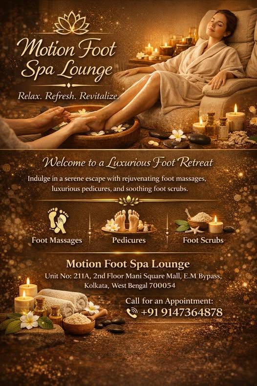Conveniently located at Unit No. 211A, 2nd Floor, Mani Square Mall, E.M. Bypass, Kolkata – 700054, our spa is easily accessible for anyone looking to escape into relaxation without traveling far. Whether you need quick stress relief or a complete wellness experience, Motion Foot Spa Lounge is the perfect destination.