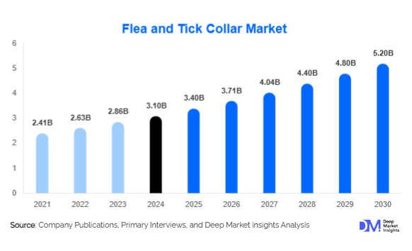 According to Deep Market Insights, the global Flea and Tick Collar Market size is projected to grow from USD 3.4 Billion in 2025 to reach USD 5.2 Billion by 2030, expanding at a CAGR of 9% during the forecast period (2025–2030).