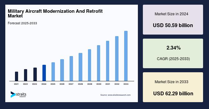 According to StraitsResearch, the global military aircraft modernization and retrofit market size is valued at USD 50.59 billion in 2024 and is estimated to reach USD 62.29 billion by 2033, growing at a CAGR of 2.34% during 2025-2033.