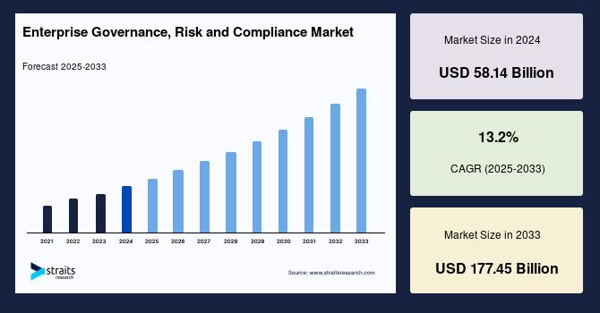 According to StraitsResearch, the global enterprise governance risk and compliance market size is valued at USD 58.14 billion in 2024 and is estimated to reach USD 177.45 billion by 2033, growing at a CAGR of 13.2% during 2025-2033.