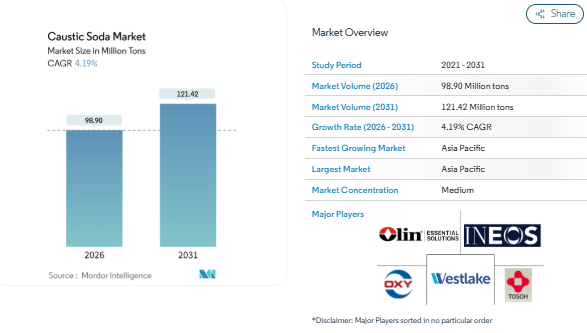 The global Caustic Soda Market is poised for steady growth, with the market size estimated at 98.90 million tons in 2026 and projected to reach 121.42 million tons by 2031. This reflects a CAGR of 4.19% during the forecast period, driven by rising demand across multiple industrial applications. Caustic soda, also known as sodium hydroxide, is an essential chemical used in