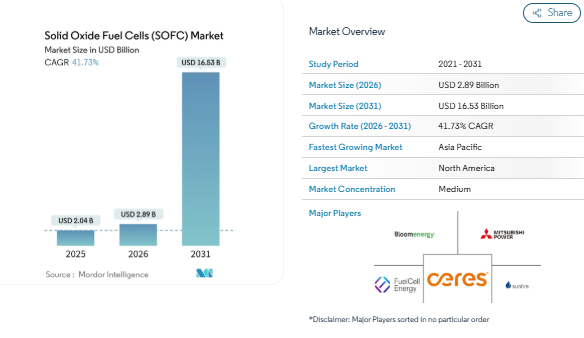 Solid Oxide Fuel Cells (SOFC) Market Expansion Forecast at 41.73% CAGR (2026–2031)
