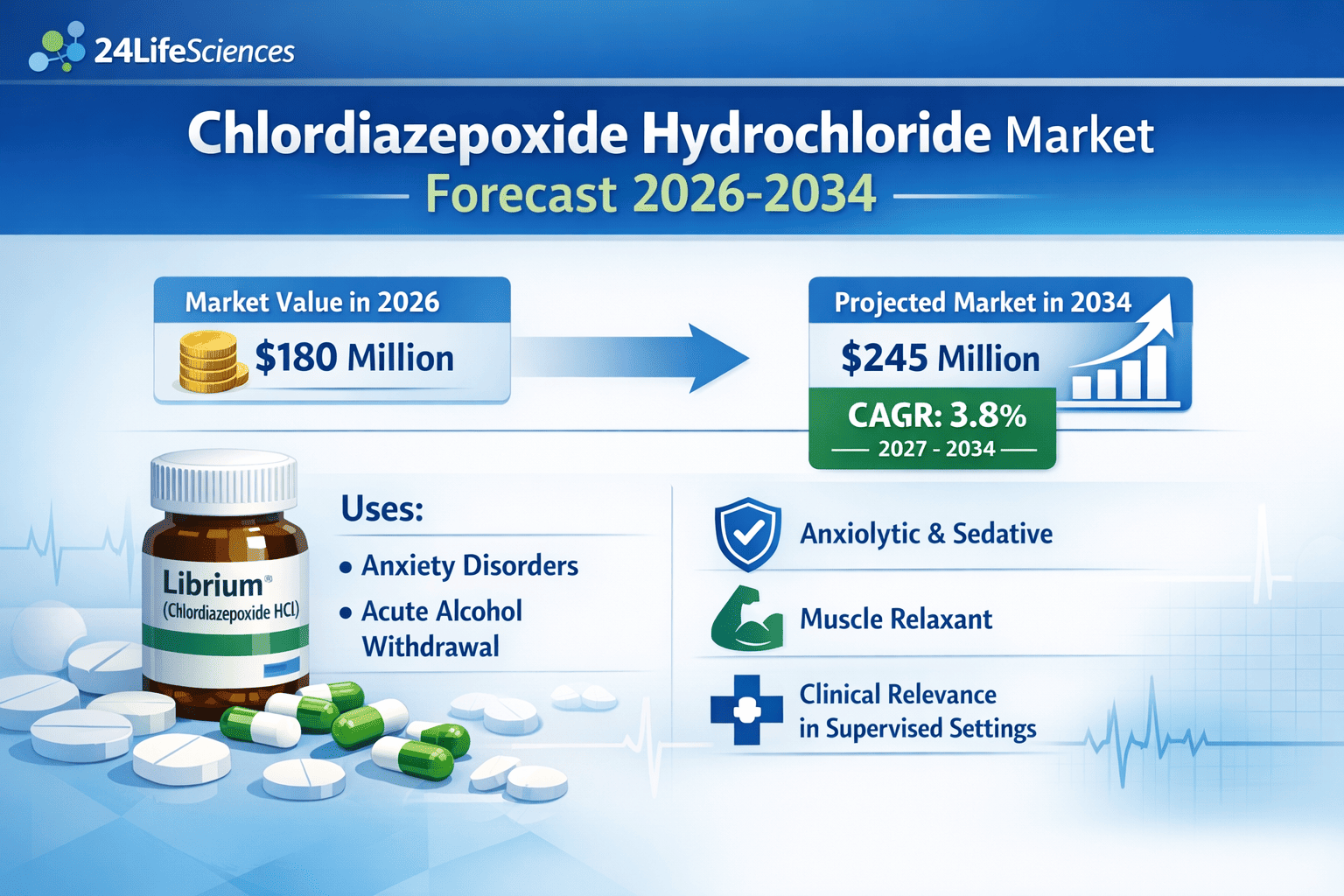 According to a newly published market research report by 24LifeSciences, global Chlordiazepoxide Hydrochloride market was valued at USD 180 million in 2026 and is projected to reach USD 245 million by 2034, growing at a compound annual growth rate (CAGR) of 3.8% during the forecast period 20272034.