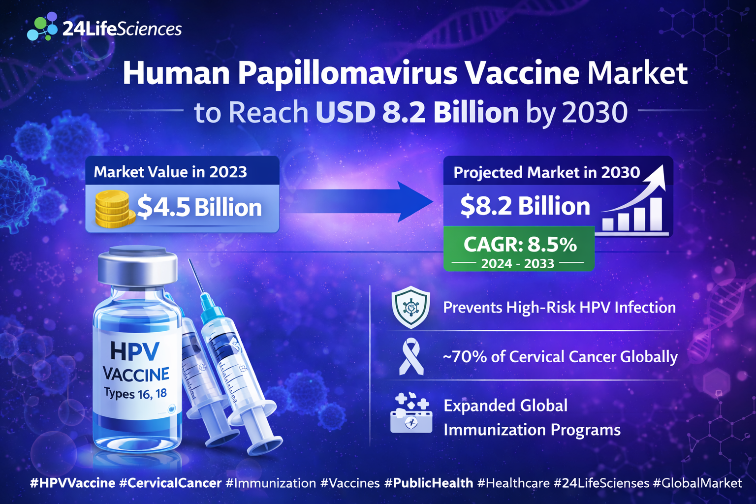 According to a newly published market research report by 24LifeSciences, global Human Papillomavirus Vaccine (Types 16, 18) market was valued at USD 4.5 billion in 2023 and is projected to reach USD 8.2 billion by 2030, growing at a compound annual growth rate (CAGR) of 8.5% during the forecast period 20242030.