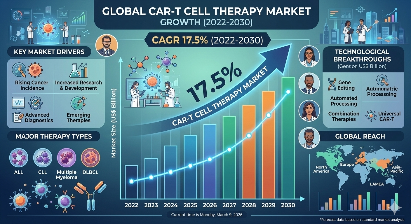 The global CAR-T Cell Therapy Market is witnessing rapid expansion due to the growing demand for advanced cancer treatment solutions. According to recent research analysis, the market size is projected to grow from US$ 2.79 billion in 2022 to US$ 10.13 billion by 2030, registering a CAGR of 17.5% during 2022–2030. This strong growth is largely driven by increasing cancer prevalence, rising clinical research activities, and significant advancements in cellular and gene therapies. CAR-T cell therapy has emerged as one of the most innovative treatment approaches in oncology, offering promising outcomes for patients with certain types of cancer that are resistant to traditional treatments.