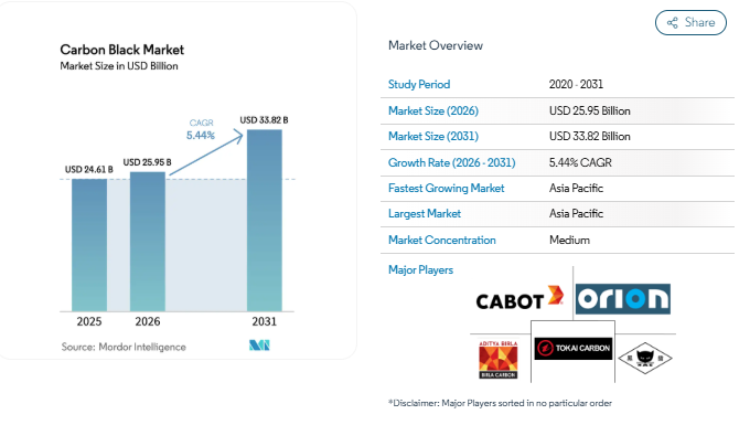 The Carbon Black Market is an important part of the global chemical industry as carbon black is widely used in tires, plastics, coatings, inks, and industrial rubber products. According to industry analysis, the Carbon Black Market Size was valued at USD 24.61 billion in 2025, increasing to USD 25.95 billion in 2026, and is projected to reach USD 33.82 billion by 2031. The market is expected to grow at a steady pace during the forecast period due to expanding demand across multiple industries.
