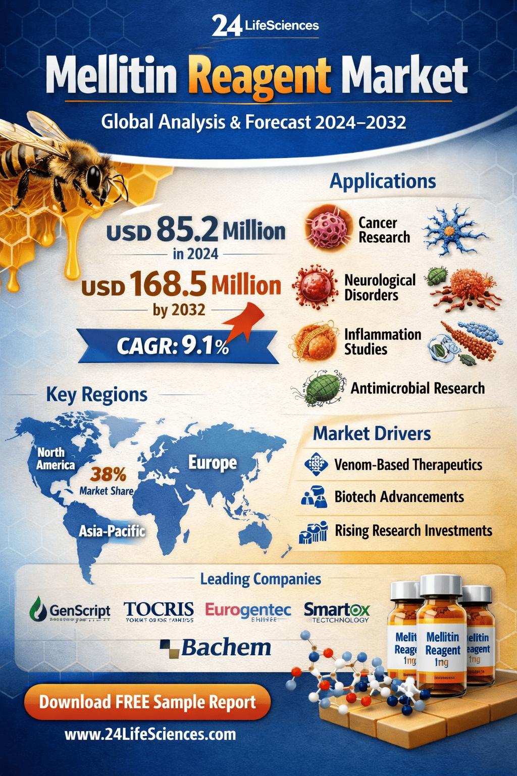 According to a newly published market research report by 24LifeSciences, the global mellitin reagent market was valued at USD 85.2 million in 2024 and is projected to reach USD 168.5 million by 2032, growing at a compound annual growth rate (CAGR) of 9.1% during the forecast period 2025–2032.