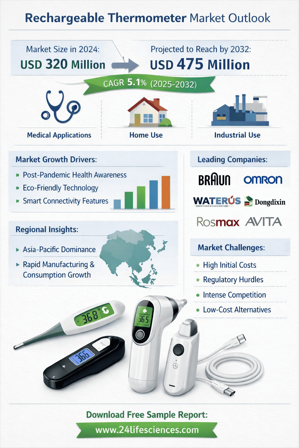 According to a newly published market research report by 24LifeSciences, global rechargeable thermometer market was valued at USD 320 million in 2024 and is projected to reach USD 475 million by 2032, growing at a compound annual growth rate (CAGR) of 5.1% during the forecast period 20252032.