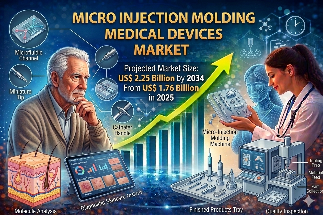 The Micro Injection Molding Medical Devices Market is projected to grow from US$ 1.76 Billion in 2025 to US$ 2.25 Billion by 2034, registering a CAGR of 5.6% during 2026–2034. This growth is supported by rising innovation in medical device manufacturing, increasing demand for minimally invasive procedures, and advancements in precision engineering technologies.
