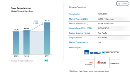 The Steel Rebar Market continues to play a central role in global construction, supporting infrastructure, residential buildings, and industrial projects. According to Mordor Intelligence, the Steel Rebar Market Size was valued at 144.75 million tons in 2025 and is estimated to grow from 152.96 million tons in 2026 to reach 201.56 million tons by 2031, registering a CAGR of 5.67% during the forecast period.