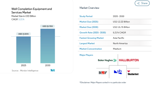 The Well Completion Equipment and Services Market is expected to grow steadily over the forecast period, with the market size estimated at USD 12.22 billion in 2025 and projected to reach USD 15.75 billion by 2030 at a CAGR of 5.21%. Rising exploration budgets, expanding offshore operations, and the growing focus on unconventional oil and gas reserves are driving the market growth. North America leads the market, but Asia-Pacific is emerging as a high-growth region, driven by ambitious exploration targets in India, Indonesia, and China.