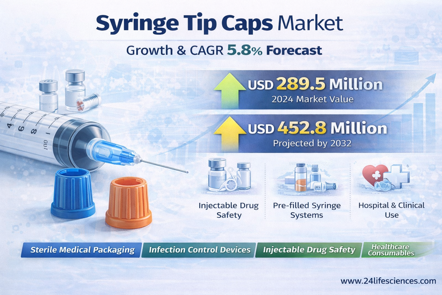 According to a newly published market research report by 24LifeSciences, global syringe tip caps market was valued at USD 289.5 million in 2024 and is projected to reach USD 452.8 million by 2032, growing at a compound annual growth rate (CAGR) of 5.8% during the forecast period 2025-2032.