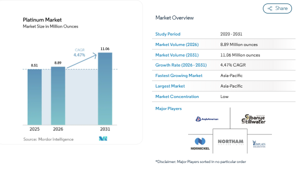 Platinum Industry Projected to Grow at 4.47% CAGR (2026–2031), Reaching 11.06 Million Ounces by 2031