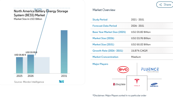 North America Battery Energy Storage System (BESS) Market to Expand at 15.87% CAGR, Reaching USD 50.02 Billion by 2031