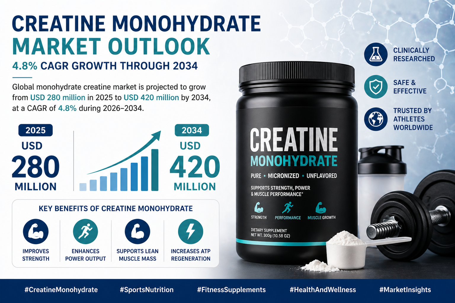 According to a newly published market research report by 24LifeSciences, global monohydrate creatine market was valued at USD 280 million in 2025 and is projected to reach USD 420 million by 2034, growing at a compound annual growth rate (CAGR) of 4.8% during the forecast period 2026–2034.