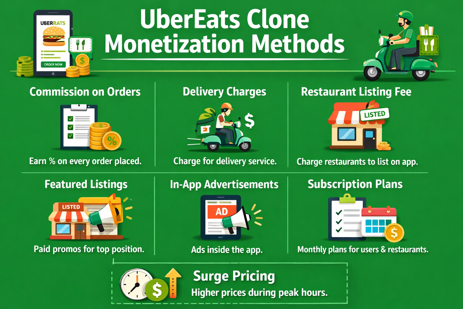 This infographic highlights the key revenue streams of an Uber Eats-style food delivery app, including commissions, delivery fees, listings, ads, subscriptions, and surge pricing. Discover how these strategies drive steady growth and profitability—start building your own delivery business today.