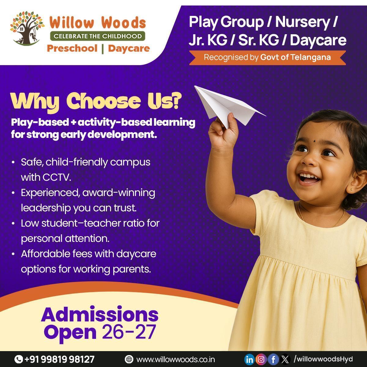 Discover the best day care in Miyapur, Mayuri Nagar with Willow Woods Schools. Our daycare provides a safe, nurturing, and stimulating environment for children, focusing on holistic growth through play-based learning, creative activities, and structured routines. Experienced caregivers, modern facilities, and child-friendly infrastructure ensure comfort, safety, and personalized attention. Willow Woods supports social, emotional, and cognitive development, giving children a strong foundation for lifelong learning. Trusted by parents for quality early childcare, we make every day engaging and enriching. Enroll now and give your child the best start in a caring environment.