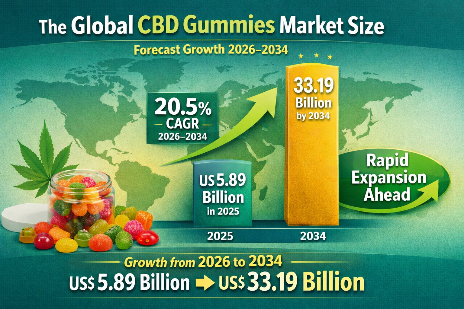 The global CBD gummies market is experiencing extraordinary expansion, evolving from a niche supplement category to a mainstream wellness phenomenon driven by widening legal acceptance of hemp-derived products, massive consumer shifts toward non-combustible CBD consumption methods, and rising prevalence of anxiety and sleep disorders worldwide. According to comprehensive market research by The Insight Partners, the CBD gummies market was valued at US$ 5.89 billion in 2025 and is projected to reach an impressive US$ 33.19 billion by 2034, registering a remarkable compound annual growth rate (CAGR) of 20.5% during the forecast period from 2026 to 2034.