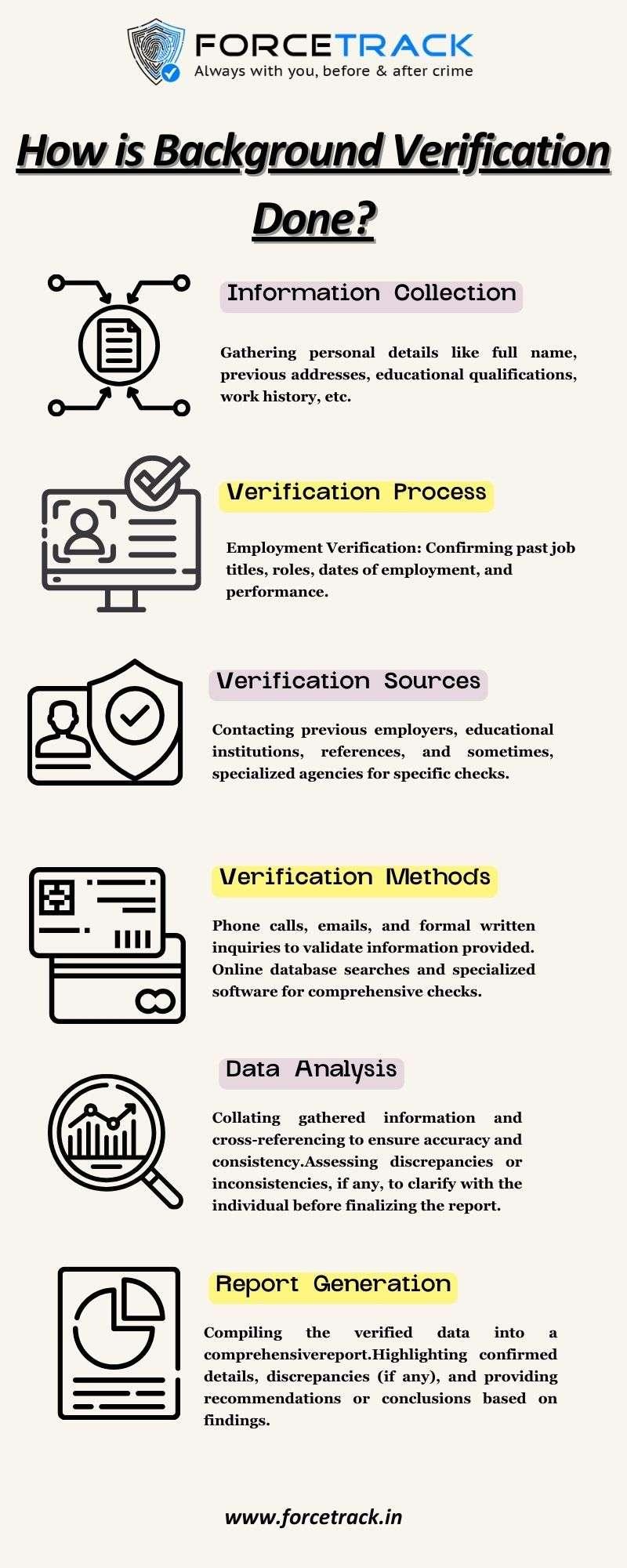 How is Background Verification Done? At Forcetrack, we specialize in meticulous background verification processes that ensure trust and reliability in your hiring decisions. Our comprehensive suite of verification services is tailored to meet your needs, providing a thorough examination of employee' backgrounds with precision and efficiency. @ https://forcetrack.in/background-verification-services/