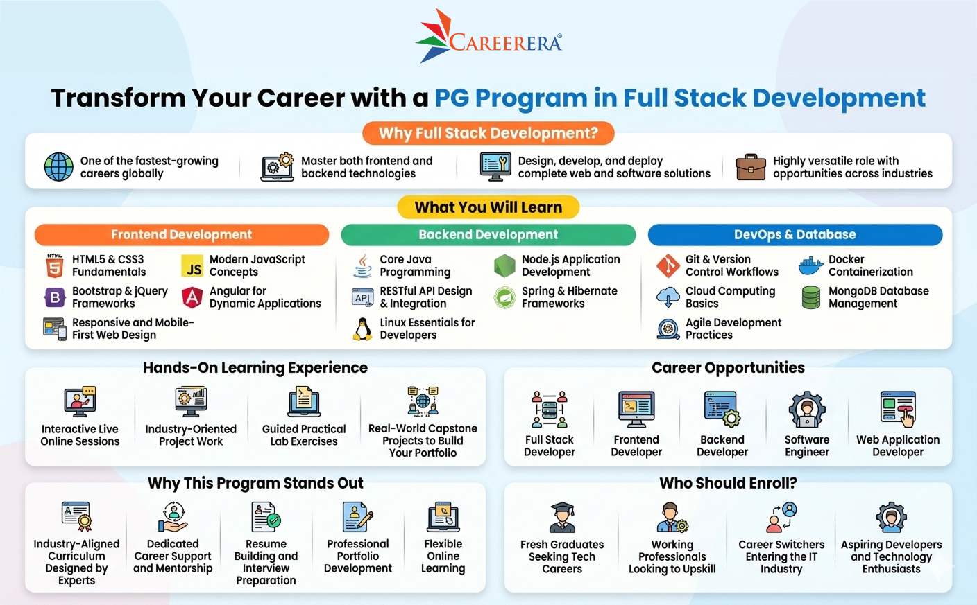 Step into the future of technology with a Post Graduate Program in full-stack development designed to transform beginners, graduates, and working professionals into industry-ready software developers. As businesses increasingly demand professionals who can build complete applications independently, full-stack development has emerged as one of the most versatile and high-growth career paths in the tech industry.The complete program equips students with skills in frontend and backend development, database management, cloud technology, and DevOps methods, enabling them to build modern web applications. The program presents a complete development path that starts from user interface design and progresses through server-side development and database integration testing.The curriculum includes industry-relevant technologies such as HTML5, CSS3, JavaScript, Angular, Java, and Node.js. Git, Linux, and Cloud Computing enable students to practice using tools that software companies worldwide employ. The program emphasizes practical learning through actual case studies, which help students develop their problem-solving and application-building abilities.The program delivers its content through an online format, which lasts for a minimum of 12 months and combines expert teaching with current educational methods and ongoing student support. The program provides students with career development support, which includes resume assessment, interview training, and job placement services to help them secure developer positions.The program enables participants to acquire skills that allow them to handle different technologies and build software through quick development techniques, and work together with others in agile environments. Students, after completing their studies, can choose from multiple career paths, which include Full Stack Developer, Frontend Developer, Backend Developer, and UI Developer positions that lead to job opportunities in startups and enterprises and global technology companies.For professionals seeking career growth, higher earning potential, and future-ready digital skills, this program provides a structured pathway to enter and succeed in the rapidly expanding software development ecosystem. For more details visit at - https://www.careerera.com/software-development/pgp-in-full-stack-development